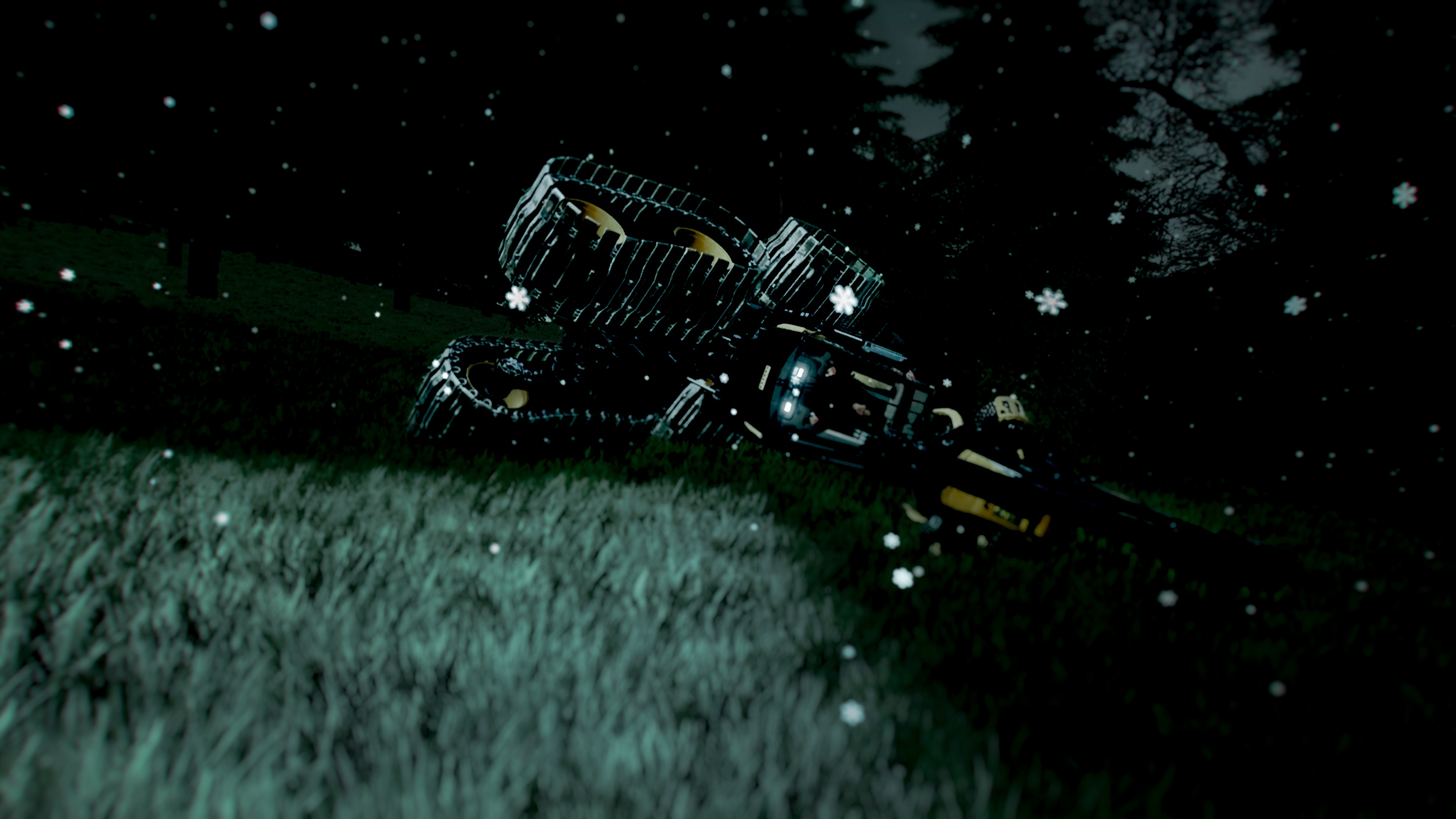 Rauchenbergers Inszenierung tendiert, in aller Ruhe, zu Beengung und Dunkelheit – und zur Überblendung von innerer und äußerer Wirklichkeit: Wie ein sterbendes Tier wälzt sich der umgekippte virtuelle Raupenbagger der Schwester durch das nächtliche Gaming-Gehölz, um im Finale jäh in ein reales Bild übersetzt zu kippen. Ein Kind blickt aus der Kabine eines kreisenden Fahrzeugs auf die Holzstapel in einem Sägewerk: entwurzelt, geschnitten, transportabel gemacht. (Stefan Grissemann)
